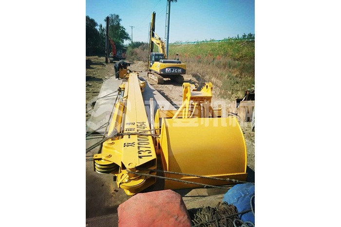 超長(zhǎng)四節(jié)臂:總長(zhǎng)度可達(dá)48米,臂內(nèi)可再伸出3節(jié),施工深度42.5米,配帶貝殼斗1.8立方或挖掘斗1.0立方。
