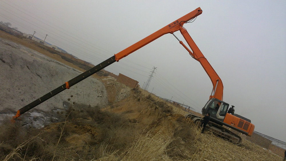 我公司生產(chǎn)的挖掘機(jī)加長臂利用超長型動臂和超長型斗桿,可在疏浚、護(hù)岸、坡面以及地鐵建設(shè)等受地面環(huán)境限制的工況下發(fā)揮巨大的威力。我們的技術(shù)人員任職于挖掘機(jī)械行業(yè)十余年,有豐富的制造經(jīng)驗(yàn)。采用先進(jìn)的電腦2D、3D輔助設(shè)計(jì)系統(tǒng)設(shè)計(jì),并經(jīng)過設(shè)計(jì)系統(tǒng)進(jìn)行挖掘機(jī)實(shí)際動作模擬,確保產(chǎn)品的準(zhǔn)確性及可靠性,通過各類加工設(shè)備,熟練員工技能和實(shí)際應(yīng)用知識和經(jīng)驗(yàn),從應(yīng)力分析、材質(zhì)選擇、技術(shù)和工藝、設(shè)計(jì)制作等方面保證了挖掘機(jī)加長大小臂的結(jié)構(gòu)強(qiáng)度、使用性能和質(zhì)量。 挖掘機(jī)加長臂主要適用于土砂、混凝土等建筑搬運(yùn)、高速公路坡面修整及河道疏通清淤工程及較深的建筑基礎(chǔ)、河道、深溝等土石方挖掘作業(yè),通過在原挖掘機(jī)的基礎(chǔ)上安裝挖掘機(jī)加長臂,能完成標(biāo)準(zhǔn)臂無法達(dá)到的距離,使挖掘機(jī)最大限度的發(fā)揮其用途,廣泛作業(yè)于各種施工現(xiàn)場,使效率和安全性更高。